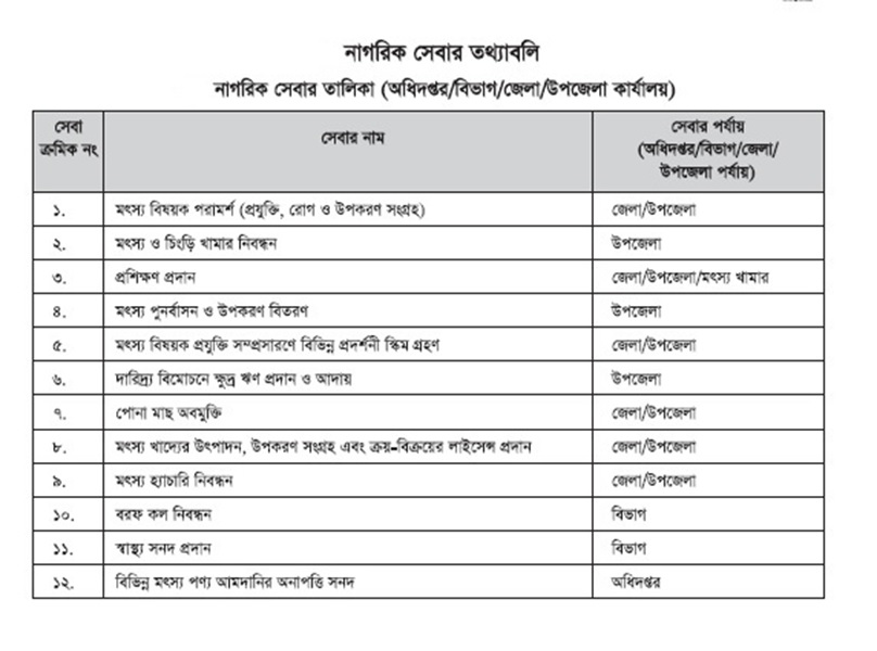 | ৭ | দেশীপ্রজাতি মৎস্য সংরক্ষ ও সম্প্রসারণে সহায়তা সেবা প্রদান। | অবতরন কেন্দ্র/ উদ্যোক্তা/জনগন | অফিসের সময় |